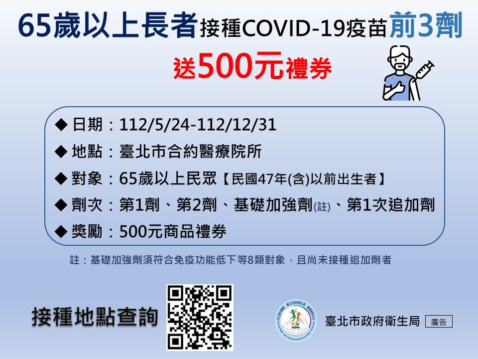 為配合中央COVID-19疫苗獎勵政策,北市政府衛生局宣布,即日起至112年12月31日止,凡65歲以上民眾於台北市合約醫療院所接種COVID-19疫苗前3劑均可獲得500元商品禮券。
