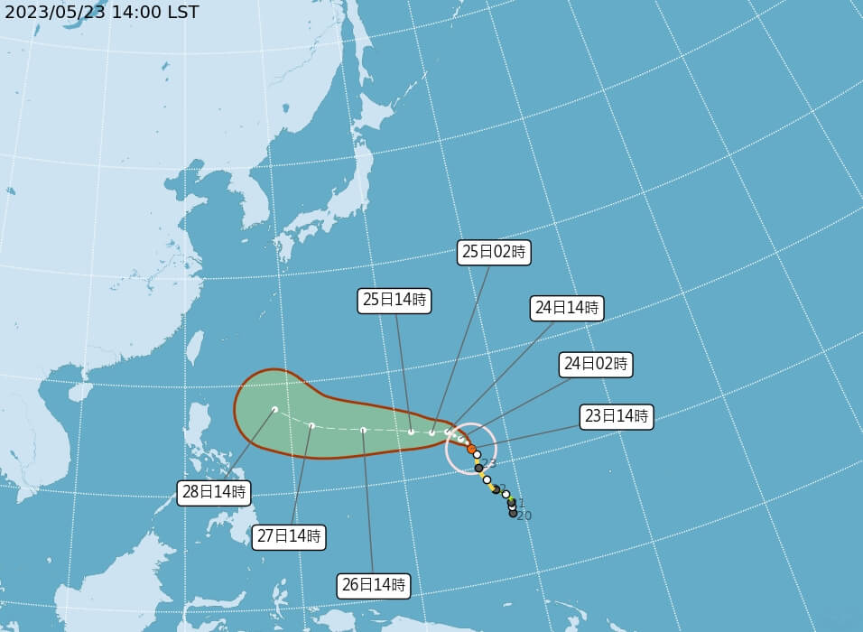 氣象局指出,瑪娃目前正向西北轉西北西方向前進,預計24日清晨增強為強烈颱風。在未來的路徑上,預計會先朝西北西方向移動,然後在28日到達菲律賓東方海面後轉向北方。在這個時候,關鍵將是太平洋高壓系統的強度,將決定瑪娃轉向北方的角度,從而影響對台灣的影響程度。