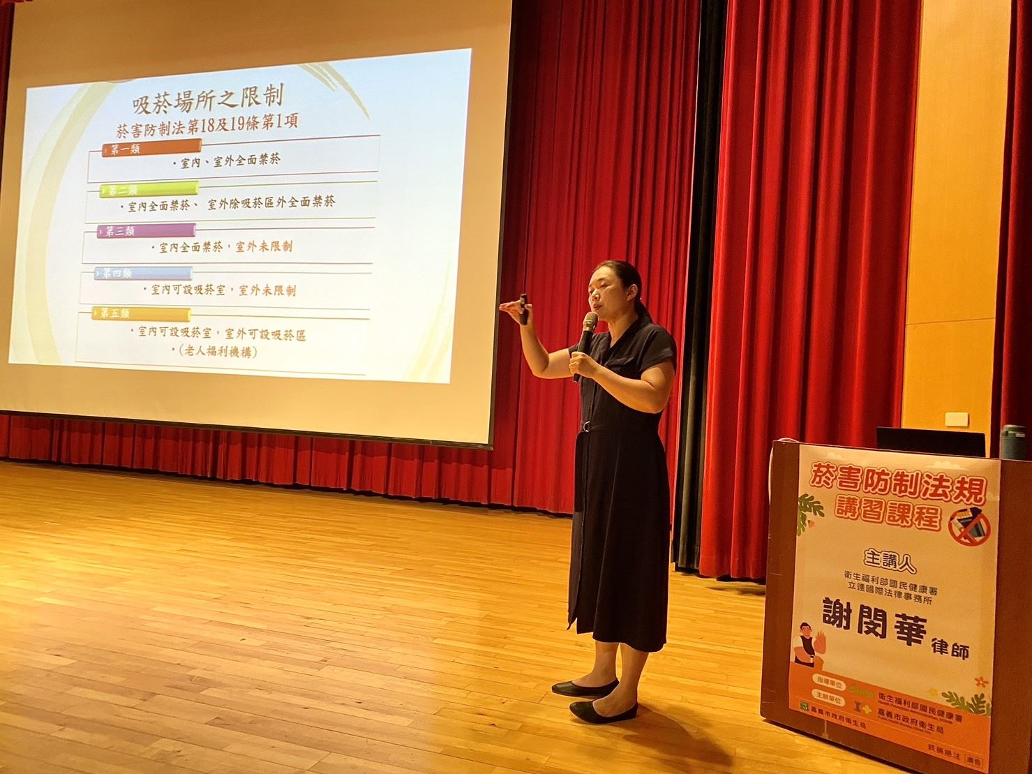 為響應5月31日世界無菸日以及6月3日禁菸節,嘉義市政府衛生局今(5/26)日在佛光山嘉義會館辦理「112年菸害防制法規講習」,邀請嘉義市各菸品販賣業者、醫事機構、社會福利機構、餐飲業、各級學校、旅宿業、休閒娛樂業、金融機構、運動健身業等單位參加,聘請立達國際法律事務所謝閔華律師針對「菸害防制新法政策、電子煙與加熱菸的差別與危害、販售菸品業者及禁菸場所規範」等,協助各行業了解菸害防制新法規定,避免觸法受罰。