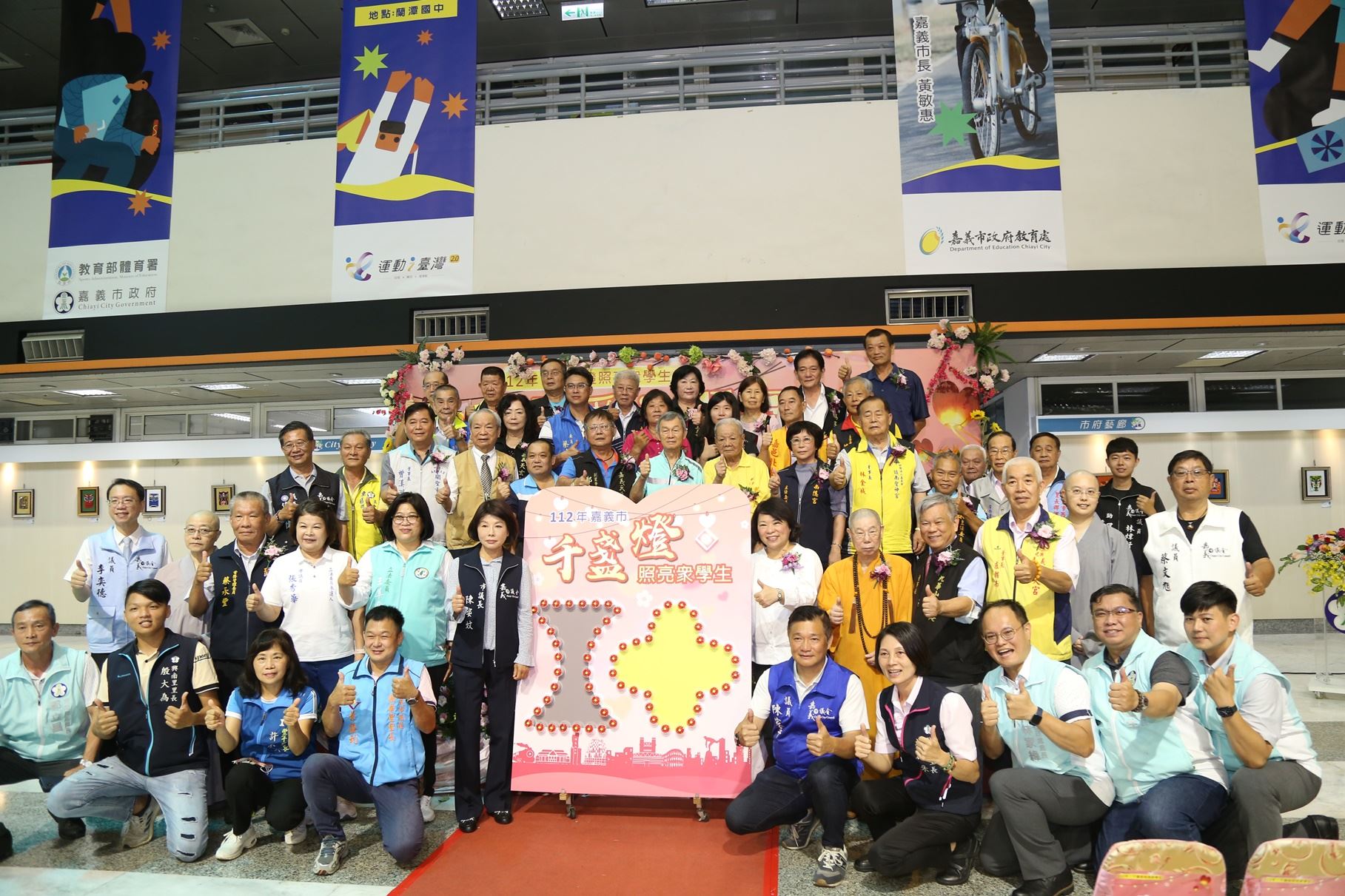「匯聚愛心、照亮我嘉─嘉義市千盞燈照亮眾學生」助學金頒發儀式2日在市府舉辦,今年總贊助金額共達292.6萬元,嘉義市長黃敏惠為參與贊助的寺廟、團體和社會善心人士頒發感謝狀,感謝他們的愛心點亮了學子的求學路。黃敏惠與議長陳姿妏、議員等貴賓共同點亮千盞燈,讓愛與善永傳遞。