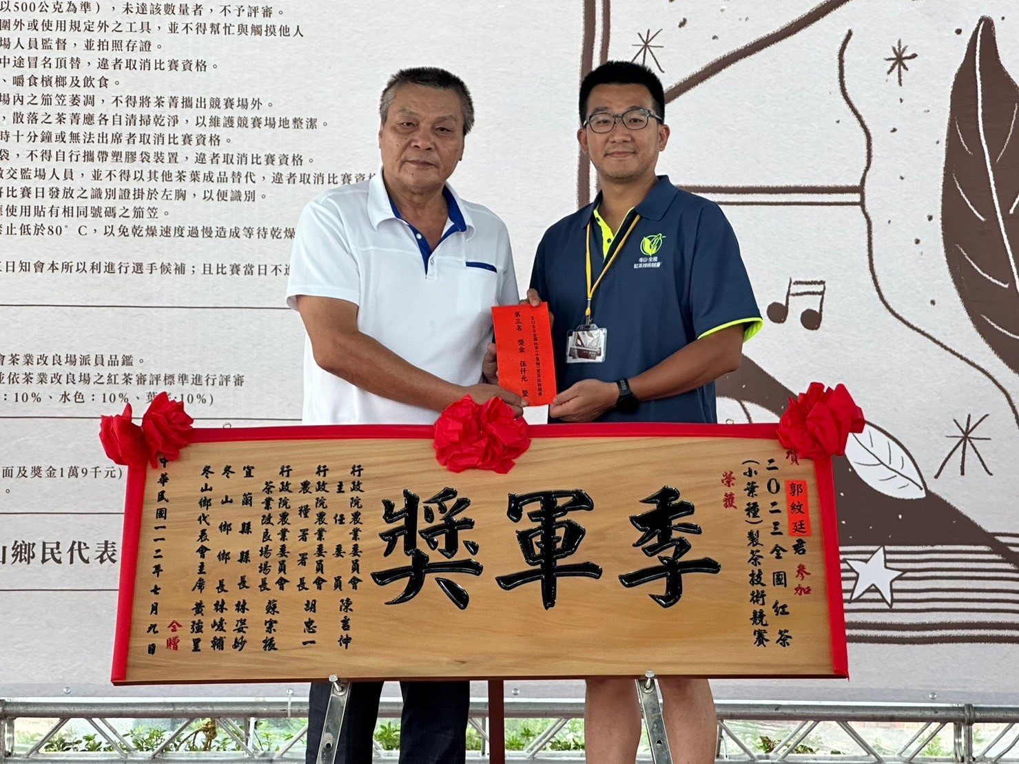 宜蘭縣冬山鄉公所7月8至9日舉辦2023全國紅茶(小葉種)製茶技術競賽,嘉義縣推派7名於縣級競賽獲佳績選手參賽,與全台45名製茶好手同台競技,最終竹崎鄉郭紋廷及葉信佑榮獲季軍。