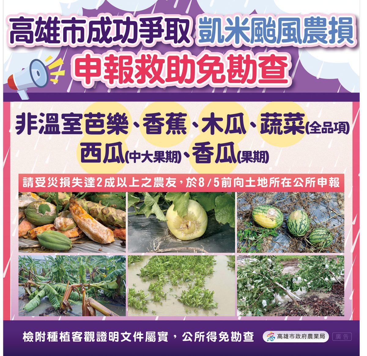高雄地區受到凱米颱風強風豪雨影響,至昨(2)日農損已超過2.1億元,又以芭樂、香蕉、木瓜、香瓜、西瓜及蔬菜類佔約9成。為加速勘查程序,除已符合農業部天氣參數災損嚴重免勘查資格的香瓜(果期)跟西瓜(中大果期),市府再向農業部成功爭取非溫室種植的芭樂、香蕉、木瓜及蔬菜全品項納入免勘查救助項目,協助農民儘速復耕。