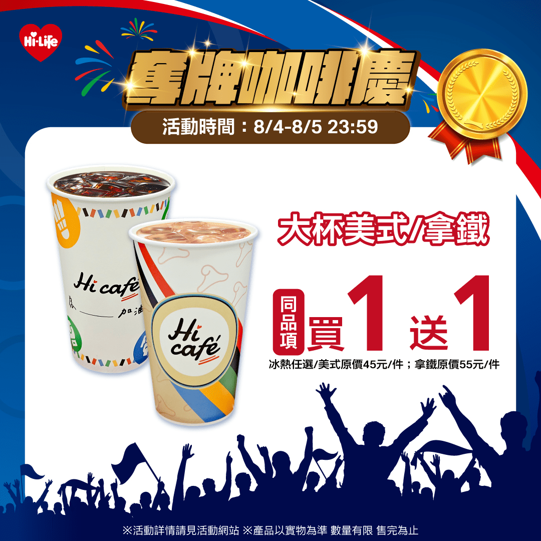 歡慶「麟洋配」二連霸奪金成功,萊爾富即日起至8月5日23:59也推出Hi café大杯系列的美式咖啡(原單件售價45元)或拿鐵咖啡(原單件售價55元),可冰/熱任選,享同品項買1送1,還有夏日消暑必備的濃巧脆脆雪糕/焦糖脆脆雪糕(原單件售價40元)也享任選買1送1。