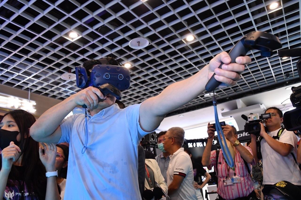 致詞結束後,蔣萬安也前往動態展示區進行巡禮,不僅體驗極限競速賽車、Acer ekinekt酷騎桌、ROG Ally電競掌機,更戴起了VR眼鏡來體驗虛擬射箭,除此之外,也在現場玩起了擴增實境小遊戲。