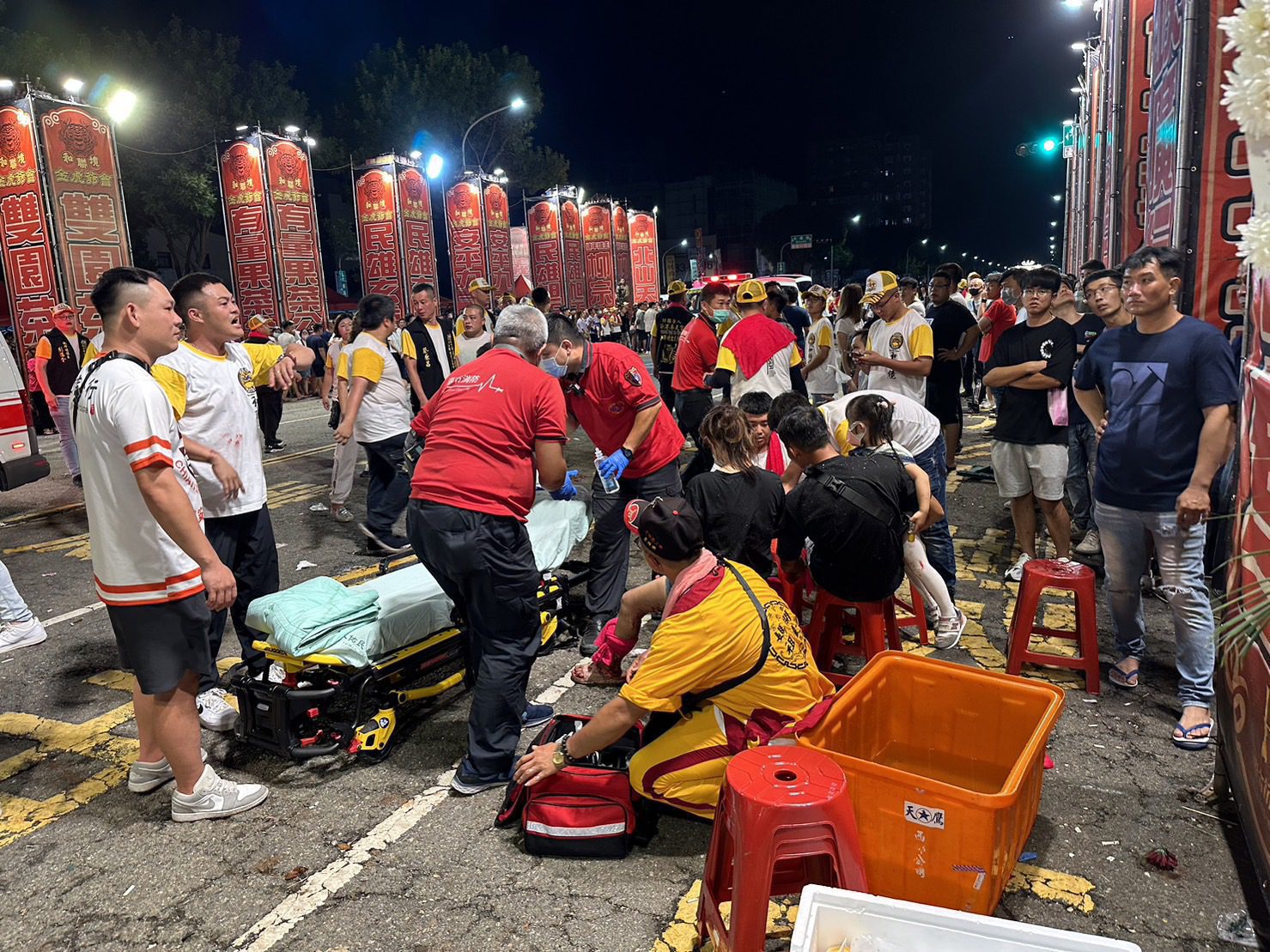 嘉義市消防局15日晚9時56分接獲民眾報案,指金山路廟會現場發生爆炸造成很多人受傷,立即調動10輛救護車馳往救援,將28名傷患分別送至五大醫院急救。