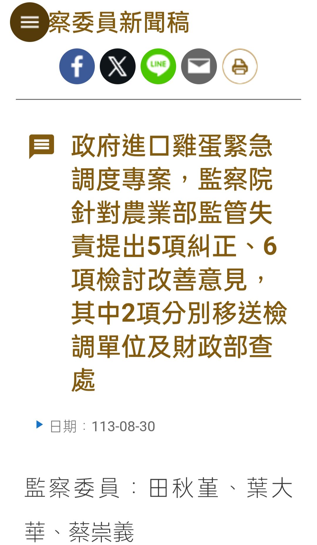 政府進口雞蛋緊急調度專案,監察院今(30日)針對農業部監管失責提出5項糾正、6項檢討改善意見,其中2項分別移送檢調單位及財政部查處新聞稿!為此,沈寂一斷時間的Lin bay好油,在臉書表示:如果你真的關心雞蛋的議題,請好好的仔細的把監察委員的新聞稿看完!