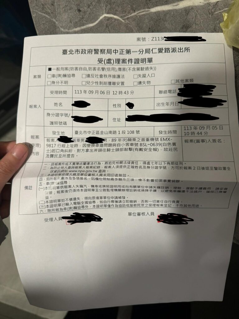5日上午10時許,左男行經金山南路一段險與騎士發生擦撞,左男被按喇叭後拿斧頭下車敲打騎士安全帽,嗆聲,「叭三小,不要錄啦,xxx啦,來告我啦」,隨後騎士也到到仁愛路派出所提告。