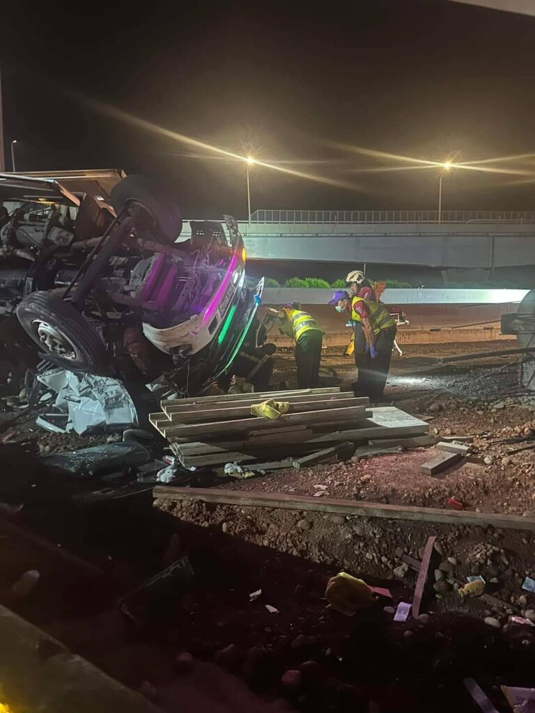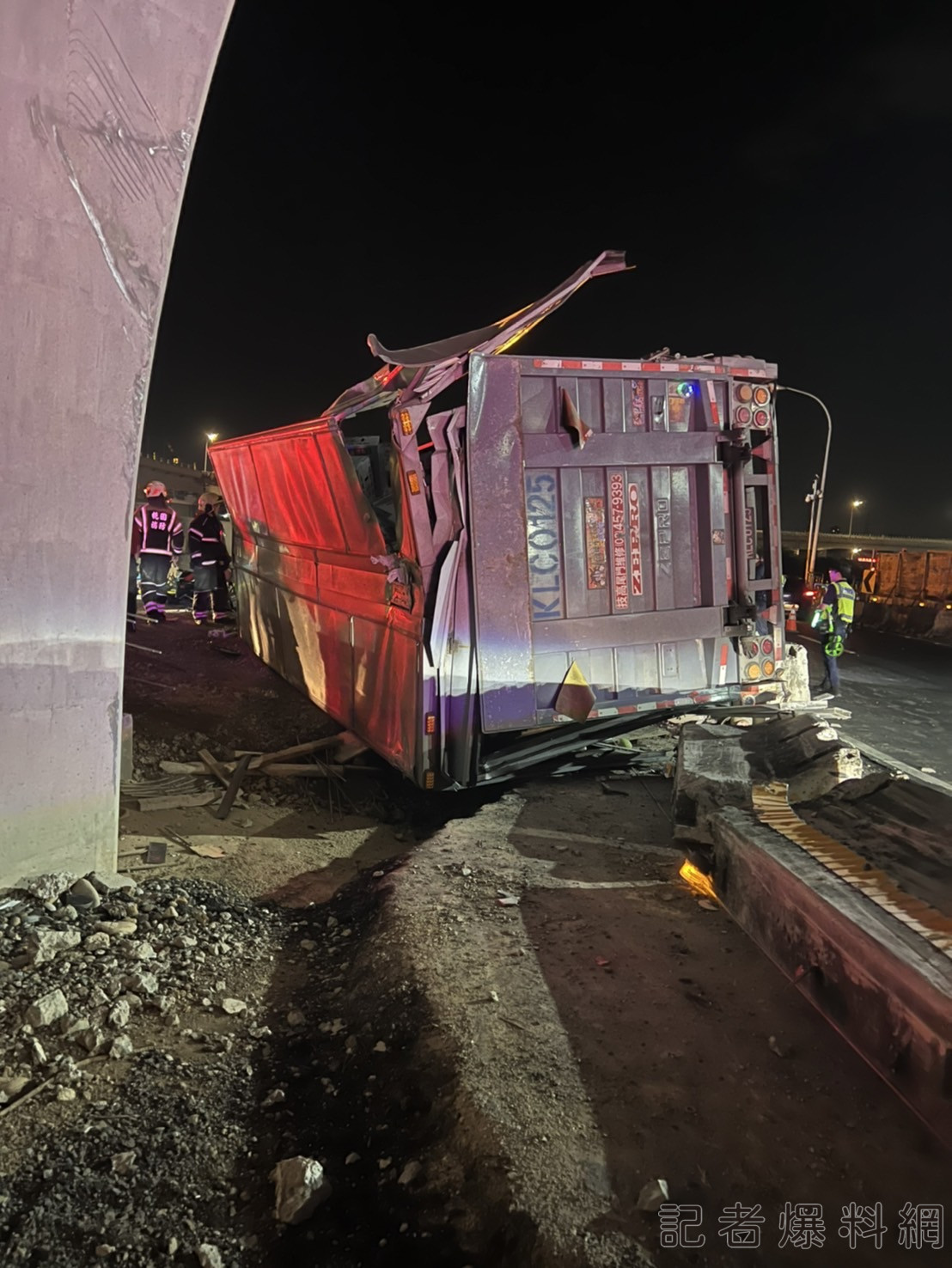 【記者爆料網 謝建成/桃園報導】國道三號南下62.5公里桃園大溪路段,在9日深夜發生重大車禍,一名34歲蔣姓連結貨櫃車司機,行經國3南下大溪交流道匝道,疑車速過快失控,從匝道衝入正在施工的大溪新增設交流道匝道,掉落平面工地翻覆,蔣男受困駕駛座,搜救人員救出蔣男呈現OHCA緊急送醫,搶救至今天凌晨宣告不治。