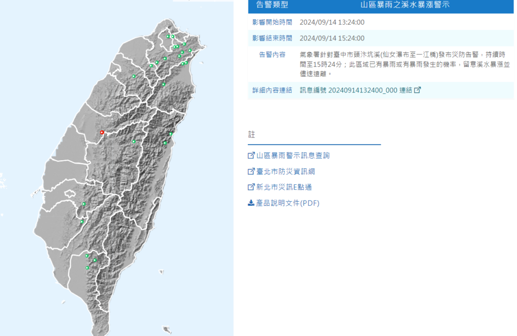 另外,氣象署針對臺中市頭汴坑溪(仙女瀑布至一江橋)發布災防告警,持續時間至15時24分;此區域已有暴雨或有暴雨發生的機率,留意溪水暴漲並儘速遠離。