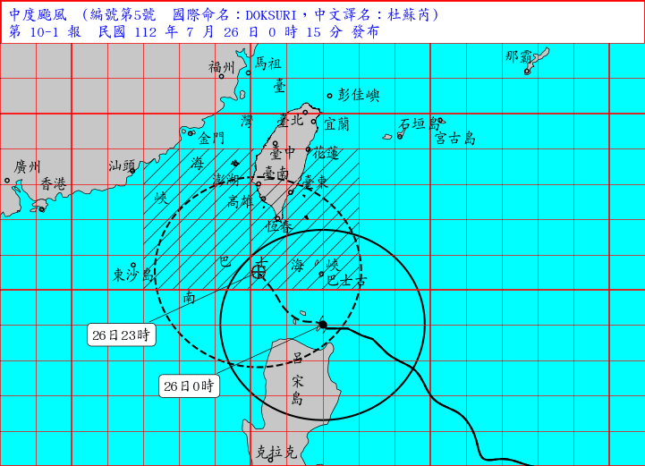 氣象局指出,颱風及其外圍環流影響,易有短延時強降雨,26日花蓮縣、臺東縣(含蘭嶼、綠島)地區及宜蘭縣山區有局部大雨或豪雨發生的機率,東北部及屏東地區有局部大雨發生的機率,請注意雷擊及強陣風,山區請慎防坍方、落石及溪水暴漲,低窪地區請慎防積水。