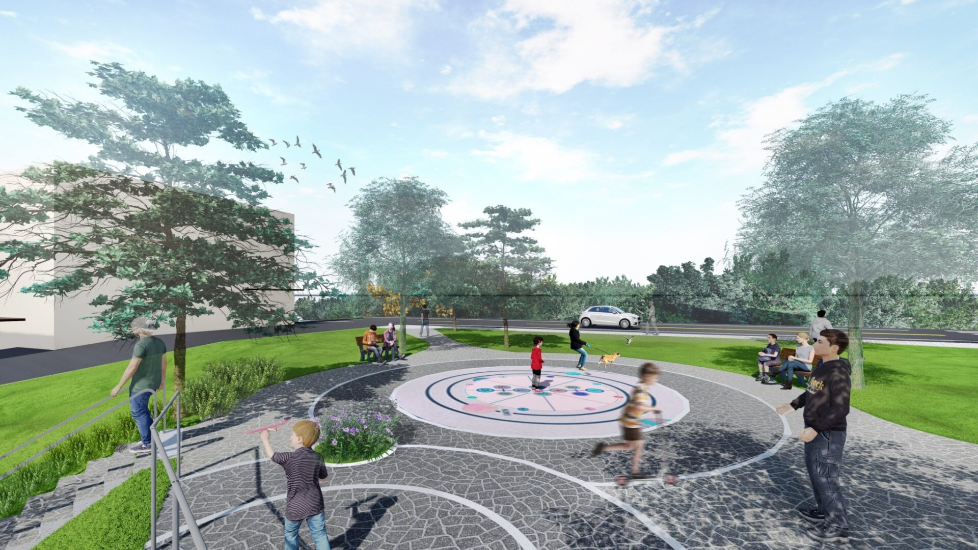 陳局長表示,此公園工程佔地約2,100平方公尺,位於大肚區平等街與博愛街口,以「日晷」為主題,融合自然元素與教育理念公園因應現況坡地條件,於高處設有日晷廣場,孩童可透過站在廣場中心,利用影子的位置來判斷時間,同時欣賞大肚區的美景。