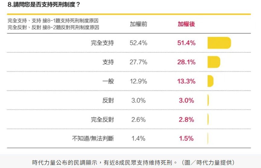 民調結果顯示,在是否支持死刑的部分,支持死刑者佔壓倒性多數,達到79.5%;反對死刑的僅有5.8%。值得注意的是,支持死刑的主要原因,最多人選擇「死刑能嚇阻或降低重大犯罪(62.2%)」,其次是「一命償一命符合公平正義(40.5%)」,「死刑可以安慰受害者家屬(33.5%)」的選項也擠進前三;關於反對死刑的理由,比例最高的是「死刑無法嚇阻或降低重大犯罪(46.5%)」,其次是「以及司法誤判風險高,死刑後生命不可回復(38.0%)」。