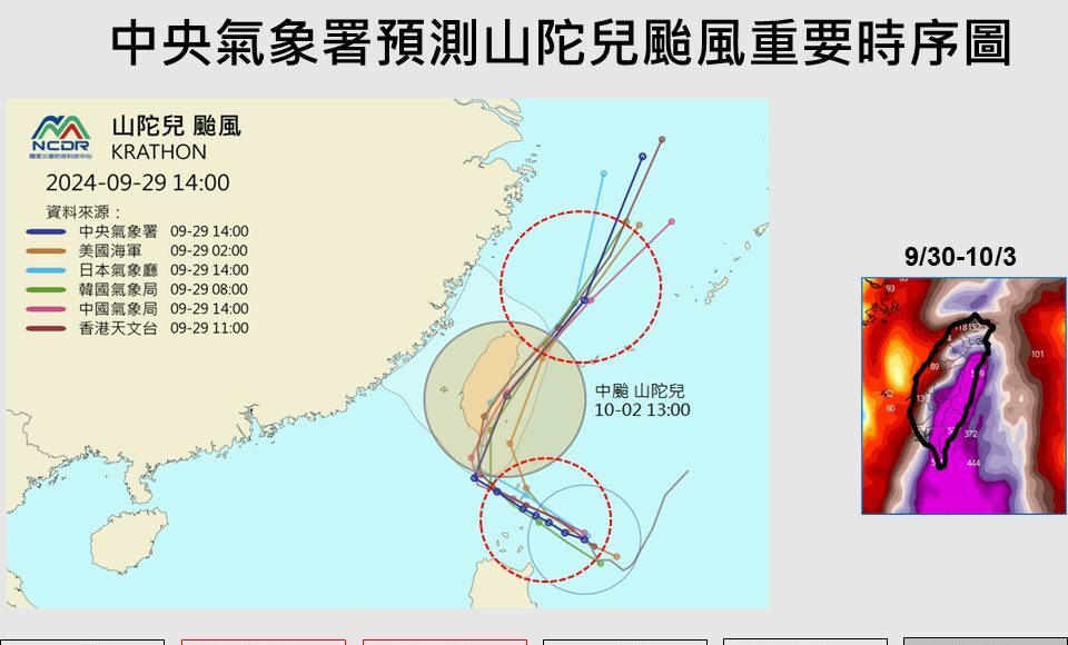 針對山陀兒,中央氣象署也發布六大時序,從9月29日上午八點半開始,發布海警、深夜十點發布陸警、30日清晨四點半,風圈觸海、預計週一(9/30)下午5點半,暴風圈觸海、要等到10月3日暴風圈才可望遠離陸地,而氣象粉專,也初步估評各地風雨程度如下: