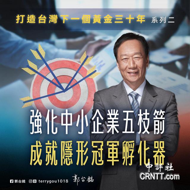 有意參選2024大選的鴻海集團創辦人郭台銘目前正在美國訪問,他昨日透過臉書提出“強化中小企業五支箭”,盼能協助中小企業轉型升級,並以多元、彈性的籌資管道,解決中小企業面臨的經營困境。將台灣打造為全球“隱形冠軍”孵化器,一起努力,打造台灣下一個黃金三十年!