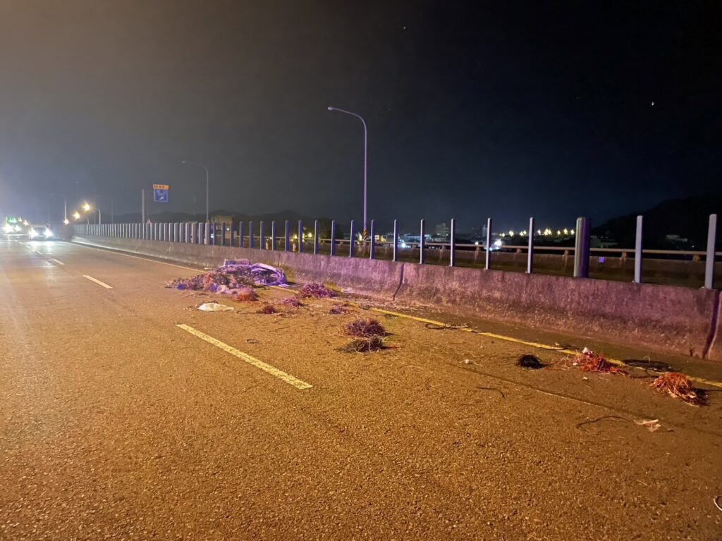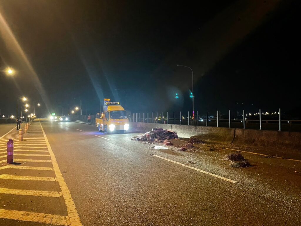 警方調閱監視器影像追查肇事車輛,已鎖定一輛營業半拖車,因未捆綁牢固並嚴密覆蓋而掉落車道,將依調查結果舉發交通違規並依公共危險移送法辦。