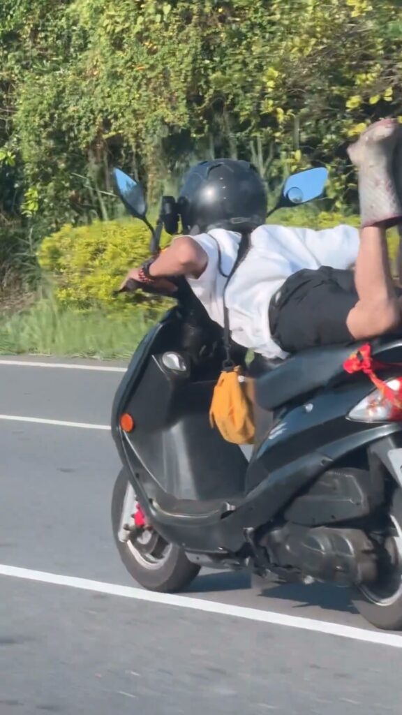 民眾一早上班時,看到有機車騎士趴著騎車,「精神都來了」。