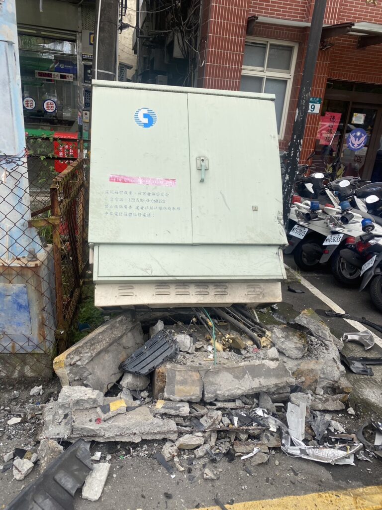 ▲撞擊巨力甚至將變電箱自水泥基座連根拔起。(翻攝畫面)