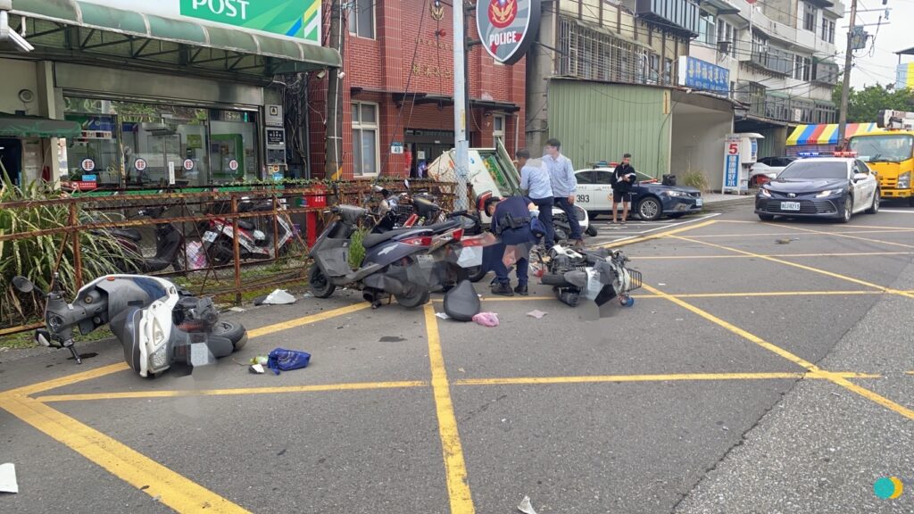 ▲事故波及現場5部機車、1部電動三輪車。(翻攝畫面)
