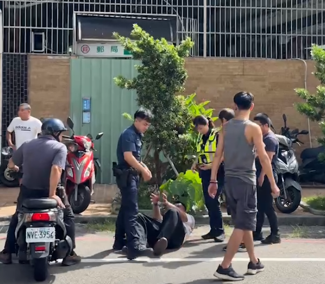 一名男子在台中市豐原區偷竊攤販包包被發現逃跑,隨即遭警方逮捕上銬。