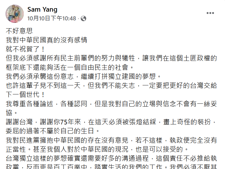 楊大正表達對中華民國國慶的不滿。(圖/翻攝楊大正臉書)