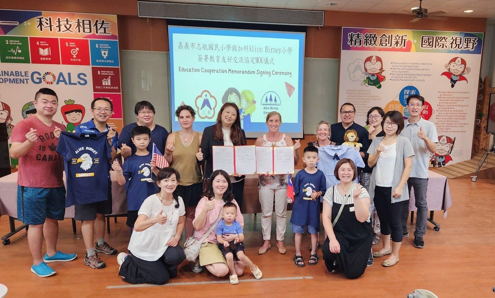 自2022年9月7日開始的第一次視訊、線上教師共備、互寄自製「學校的一天」影片、學生線上相見歡、文化箱互寄體驗、世界地球日的共做課程、畢業典禮的祝福! 歷經331天的線上交流旅程,嘉義市志航國小於8月3日上午在學校視聽教室與來自加州洪堡郡Alice Birney小學,在市府支持與親師生的見証下,共同簽署了姐妹校的正式的教育合作備忘錄MOU,這是創校74年來第一所姐妹校,雙方校長對此都感到相當興奮。