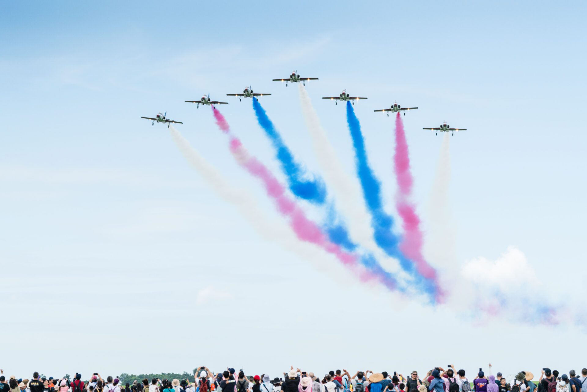 紅、白、藍三色,帶來賞心悅目的「炸彈開花」、「一箭穿心」等特技表演,清泉崗營區上空在機尾噴煙襯托下,劃出紅、白、藍色彩,十分吸睛,民眾讚嘆連連,紛紛拿起相機、手機留下最美麗的一幕。