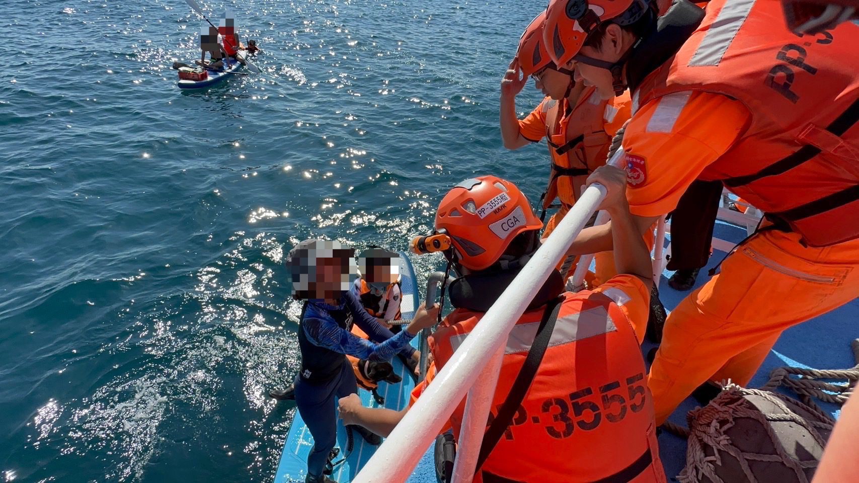 巡防艇抵達現場後,看到1艘立槳上,有3名民眾及1隻寵物犬,因浪過大體力耗盡,無法返回岸際,隨即與深澳安檢所支援的救生艇共同救援,成功將3人1犬救上巡防艇,載返深澳漁港,經檢視均無受傷情形,遇險人員對海巡人員深表感謝。