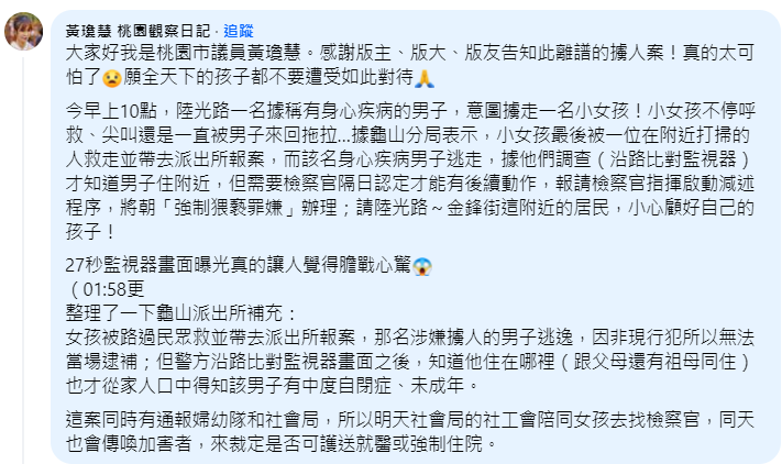 議員黃瓊慧指出,女孩被路過民眾救並帶去派出所報案,那名涉嫌擄人的男子逃逸,因非現行犯所以無法當場逮補;但警方沿路比對監視器畫面之後,知道他住在哪裡(跟父母還有祖母同住),這案同時有通報婦幼隊和社會局,所以明天社會局的社工會陪同女孩去找檢察官,同天也會傳喚加害者,來裁定是否可護送就醫或強制住院。
