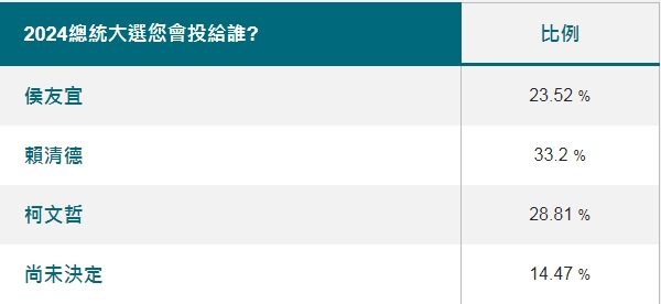 對於“2024“大選您會投給誰?”,民調顯示三個候選人支持度分別為,賴清德33.2%、柯文哲28.81%、侯友宜23.52%、尚未決定14.47%。