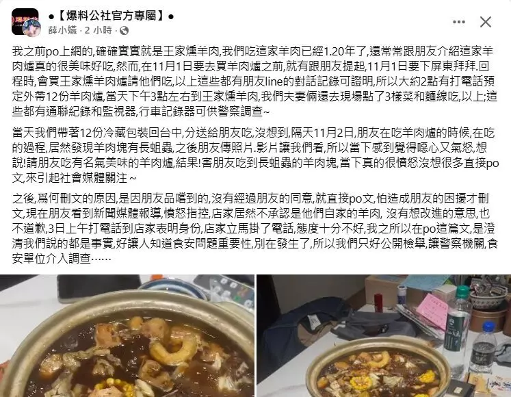 女網友在爆料公社發文指出,吃王家燻羊肉已經1、20年了,常常跟朋友介紹這家羊肉爐真的很美味好吃,11月1日去買王家燻羊肉爐,外帶12份羊肉爐,帶著12份冷藏包裝回台中分送給朋友吃,沒想到隔天11月2日,朋友在吃羊肉爐的過程,發現羊肉塊有長蛆蟲,所以才PO網,沒想到引起關注。