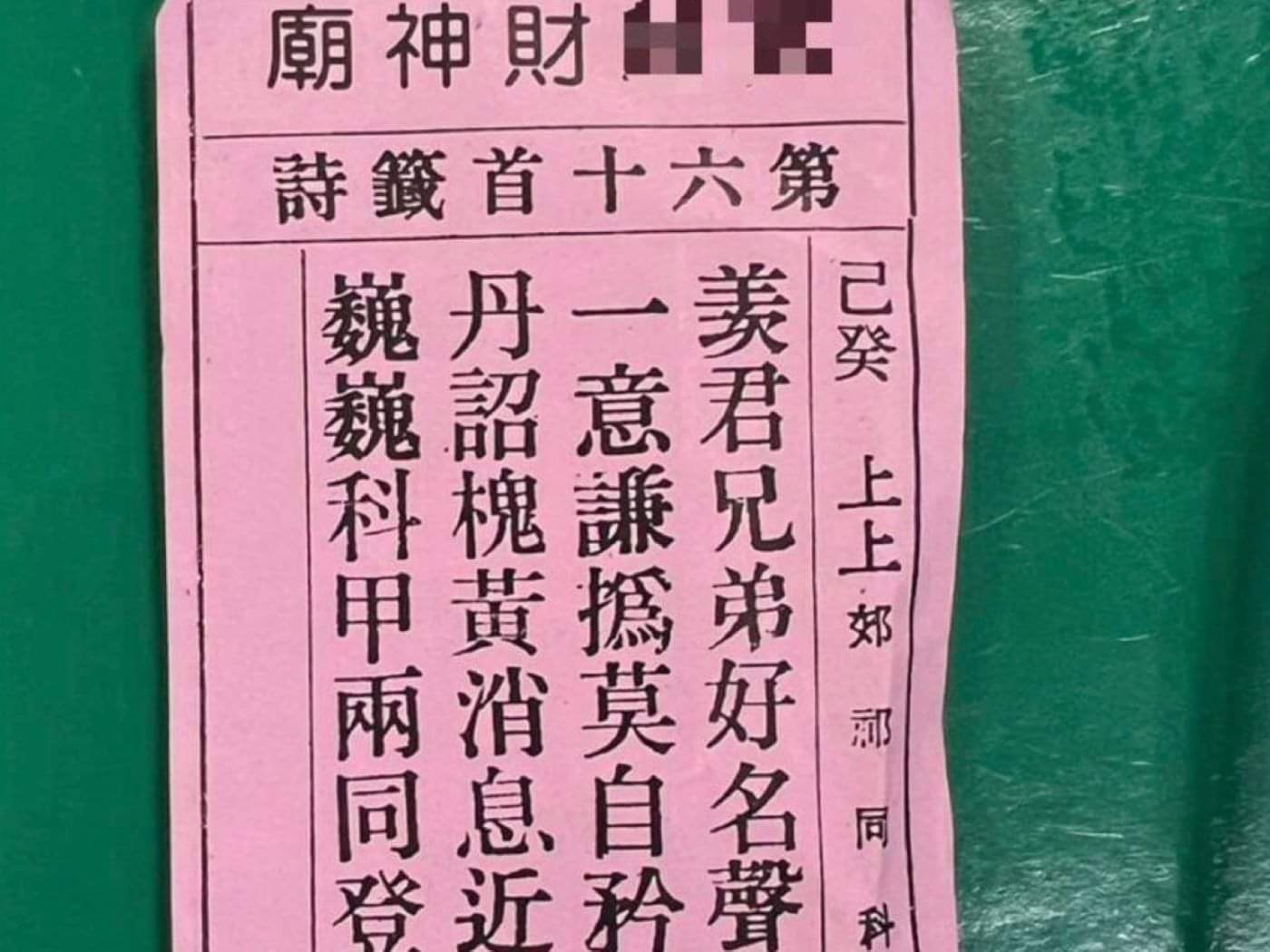 後續第二分局警方便與被害人合作佯裝要加碼投資,並在約定面交的超商內佈下警力埋伏,就在車手取款的那一刻上前逮人。落網車手一臉茫然,在警方搜索時赫然發現偽造的工作證裡面居然還夾帶著一張財神廟籤詩,仔細一看居然還是上上籤。車手解釋前陣子去香火鼎盛的財神廟,祈求事業順利及財運亨通,在卜卦多次後終求得這張好籤,以為這難得的上籤會帶來好財運,保佑工作順利,怎料才沒多久就被警方逮住,更直言說是不是這廟不夠靈驗。聞言警方也搖頭,哪有神明會保佑這樣的詐騙犯罪行為,詐騙車手真是自我感覺良好。