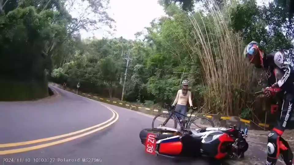 自行車女騎士在山路上衝對向,幸好重機騎士煞住,不然後果不堪設想。