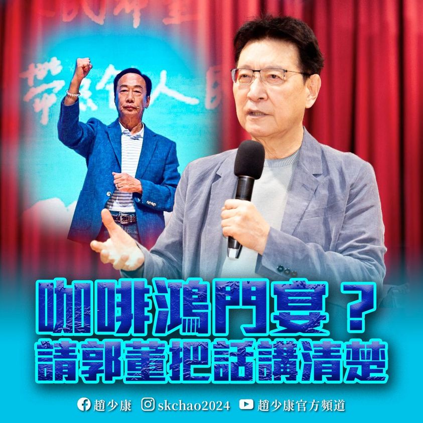 鴻海創辦人郭台銘日前喊話要邀國民黨及民眾黨總統參選人侯友宜、柯文哲喝咖啡,對此,中廣董事長趙少康痛批,現在的局面就是他近幾個月年輕氣盛的舉動才造成,之前不論說要挺侯,或是和柯文哲“海誓山盟變昨暝歹勢”,現在要大家坐下來喝咖啡,誰知道會不會又是鴻門宴?強調非綠陣營必須整合為一組人才有贏的可能,要談合作最好要具體說清楚,“否則侯柯怎敢坐下來跟他談?”