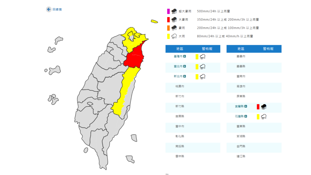 中央氣象署對宜蘭發布大豪雨特報。翻攝中央氣象署官網