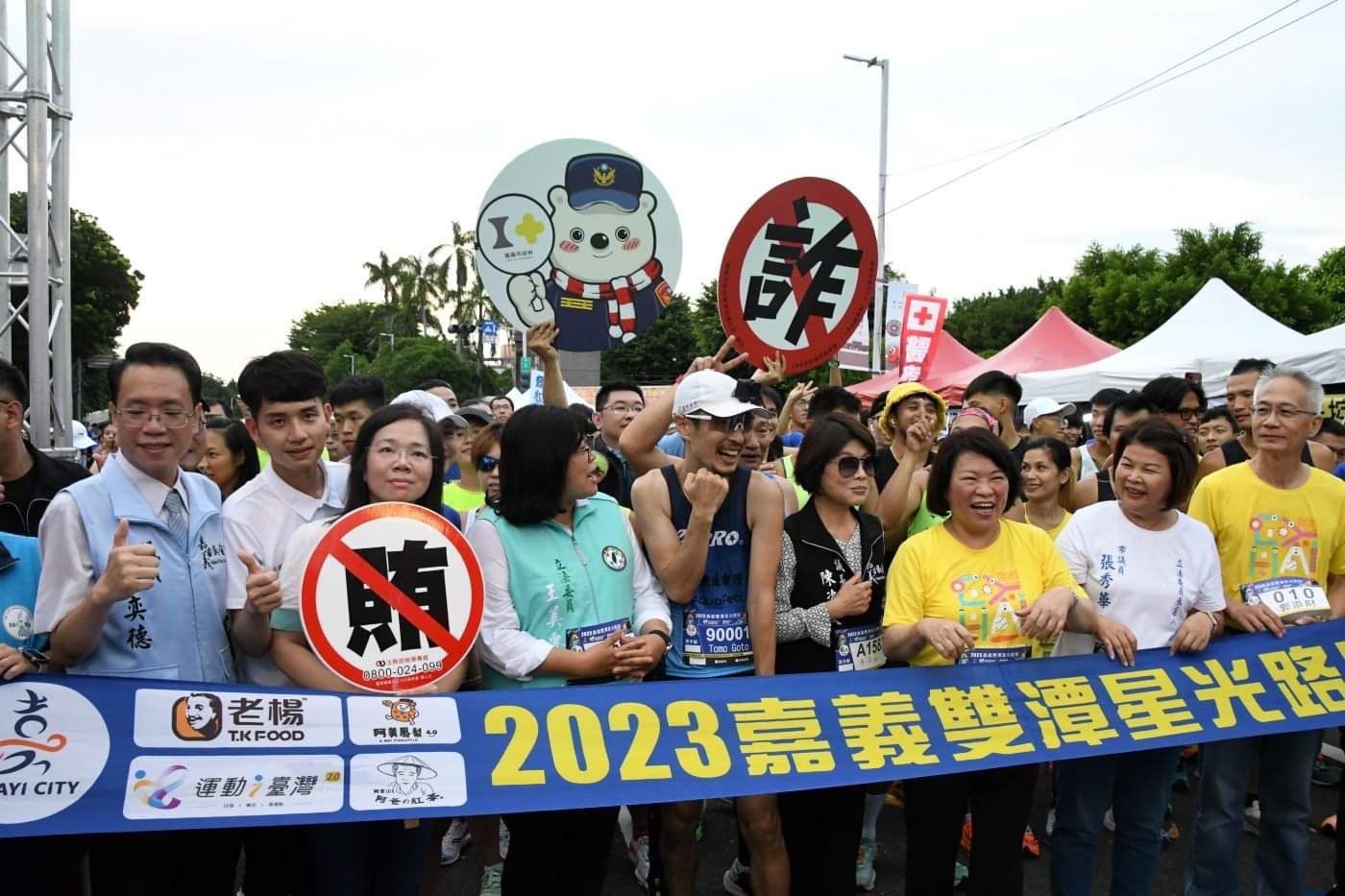 在嘉義雙潭星光路跑活動會場有民眾目擊1名跑者的號碼牌與眾不同,更有民眾目擊路跑會場有熊出沒亂竄,甚至造成現場小朋友一陣瘋狂尖叫,仔細一看,原來是嘉義市政府警察局第二分局正帶著警察大白熊及利用AR擴增實境互動拍照功能,進行反詐宣導,大家直呼超可愛。