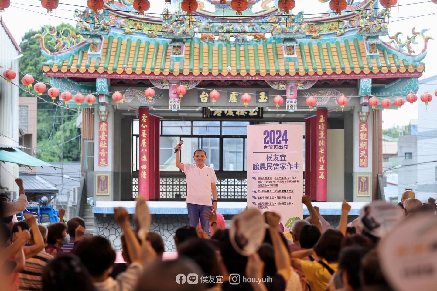 國民黨總統參選人侯友宜今天到嘉義梅山玉虛宮參香,並在廟口開講,他提出調高老農津貼不低於8000元、擴大開放移工以解決農業缺工、水利會還給農民、銷售管道制度化及增加預警機制等4大農業政策,並強調,會全力以赴,作農民靠山,拚回農民的好日子。