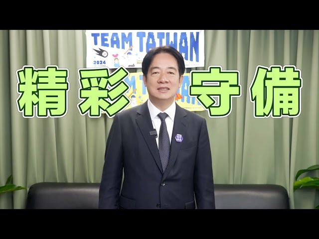 影片最後,賴總統手持藍色「台灣尚勇」應援毛巾,高呼「台灣尚勇!Team Taiwan!」(編輯:謝佳珍)1131125