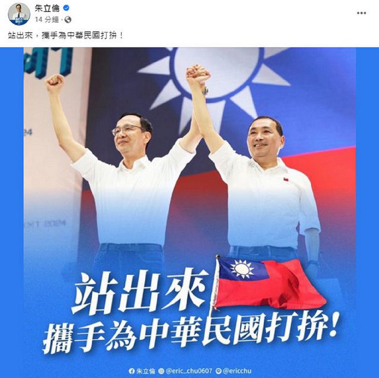 鴻海集團創辦人郭台銘今日上午在記者會上宣布,將以連署方式參選2024。中國國民黨主席朱立倫下午隨即在臉書PO出一張高舉國民黨2024參選人侯友宜手的照片寫到,站出來,攜手為中華民國打拚!表達力挺侯友宜到底的決心。