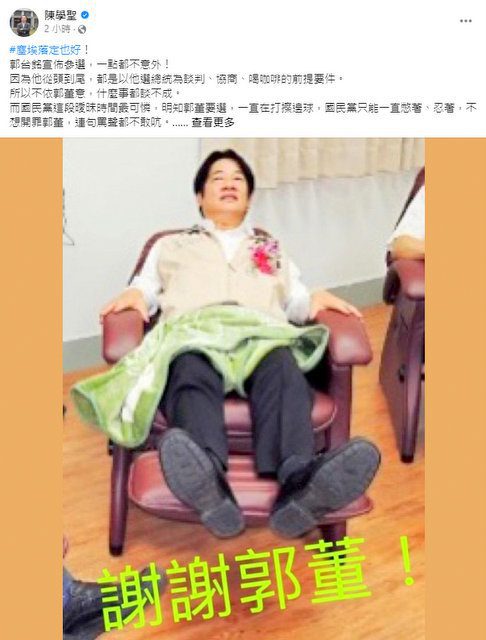 陳學聖表示,不會對郭台銘參選感到意外,因為他從頭到尾都是以選總統作為談判、協商的前提要件,“不依郭董意,什麼事都談不成”。而國民黨在這段曖昧時間則是最可憐的,因為明知郭台銘要選、一直在打擦邊球,但為了大局,卻只能一直憋著、忍著,連句罵聲都不敢吭。