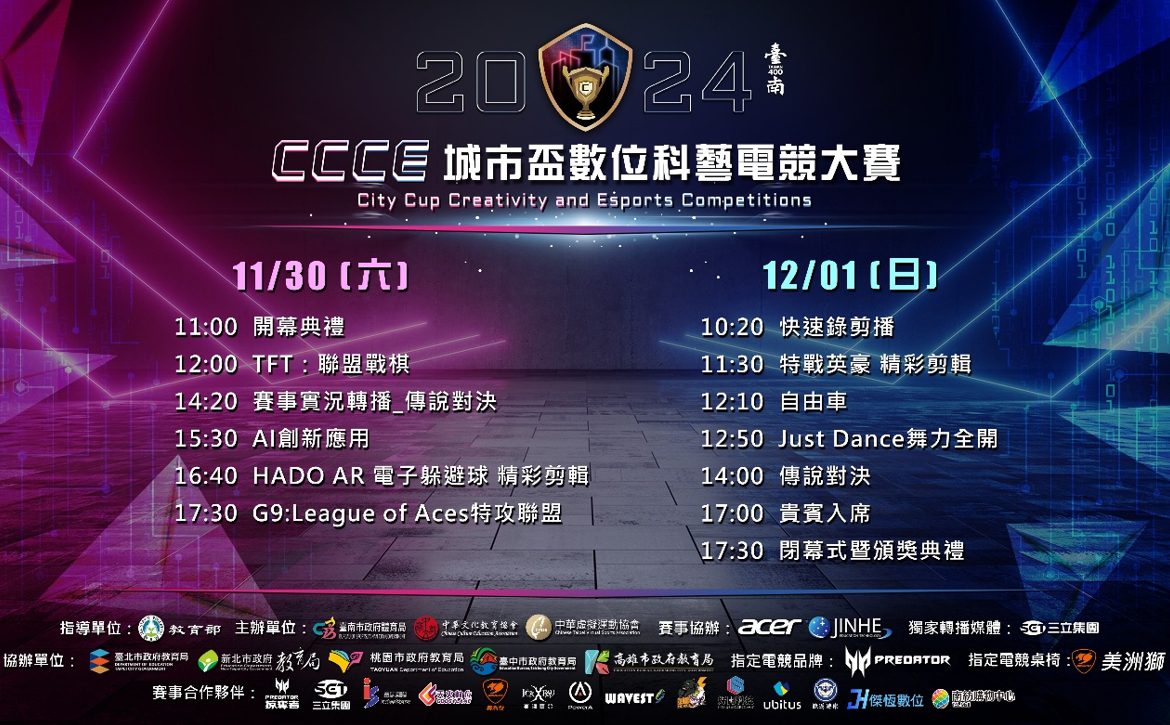 由教育部指導,臺南市政府體育局、中華文化教育協會、中華虛擬運動協會主辦,臺北、新北、桃園、臺中、高雄市政府教育局協辦的2024 CCCE城市盃數位科藝電競大賽(City Cup Creativity and Esports Competitions)壓軸盛事——線下總決賽,將於11月30日(六)與12月1日(日)在臺南市南紡購物中心A1館前廣場盛大舉行!來自全臺的頂尖選手將齊聚一堂,展開一場場技術與創意的巔峰對決,角逐年度總冠軍的榮耀。本次總決賽主辦城市為臺南市,結合臺南建城400擴大辦理,不僅是玩家們的高光時刻,更是一場結合電競、科藝、運動、娛樂與節慶氛圍的年度盛會,現場將以多元活動和驚喜體驗,讓參與者感受到數位時代的創意能量。