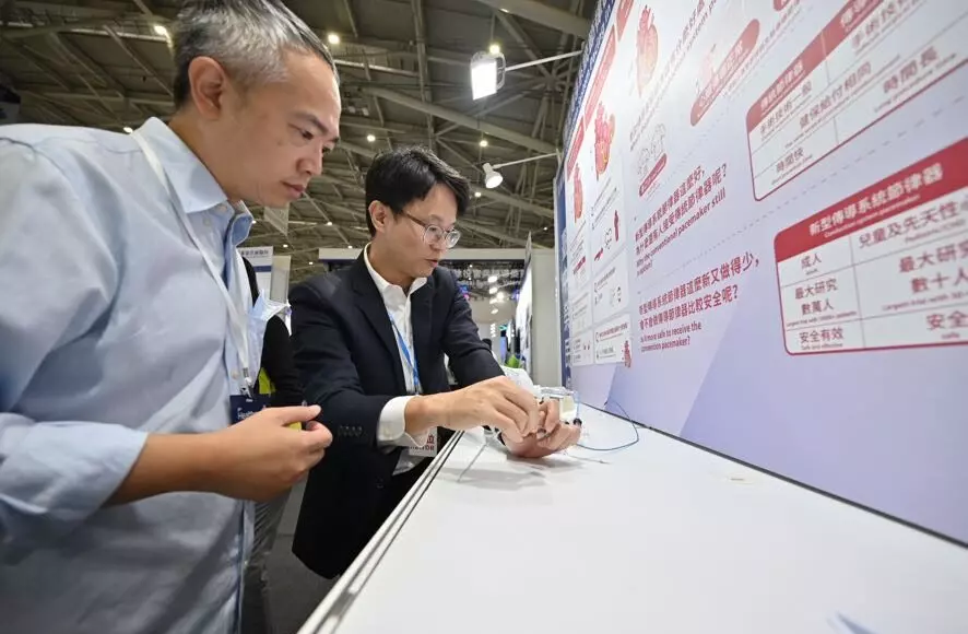 臺中榮總兒童心臟科莊傑貿醫師(右)為民眾說明新型傳導系統節律器如何治療房室傳導阻斷。台中榮總提供