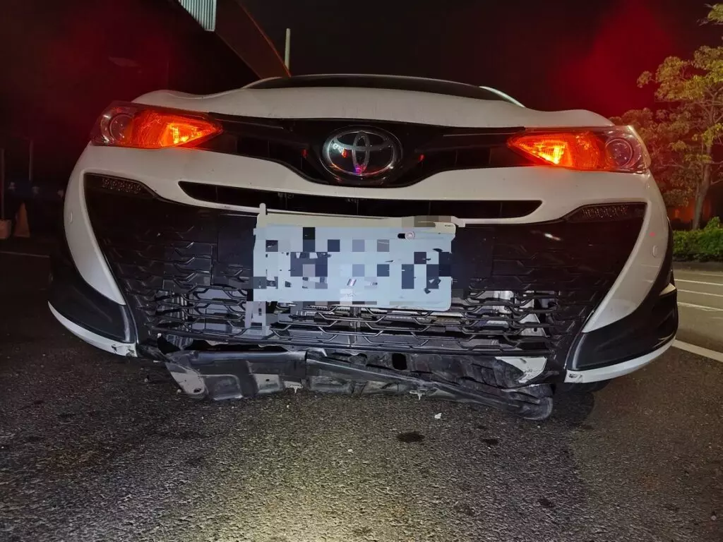 自小客車撞擊掉落胎皮致保險桿脫落。翻攝畫面