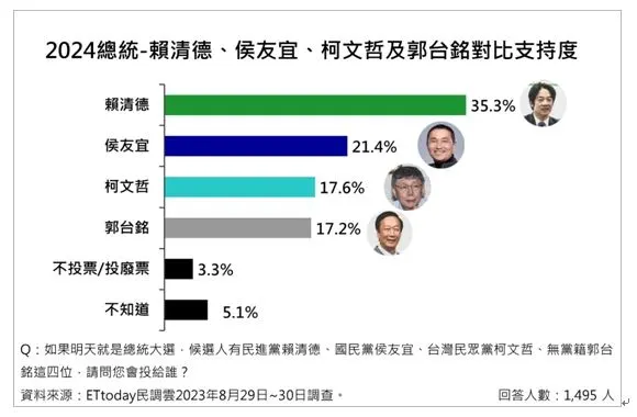 根據《ETtoday民調雲》最新民調,在民進黨賴清德、中國國民黨侯友宜、台灣民眾黨柯文哲、鴻海創辦人郭台銘4人競逐狀況下,支持度分別為賴35.3%、侯21.4%、柯17.6%、郭17.2%,柯支持度受到郭直接影響陷入拉鋸,侯則躍居第2。另外,賴、侯支持度差距13.9個百分點,賴持續領先群雄。