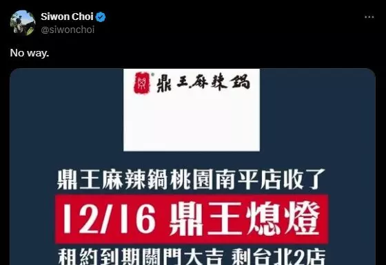 【記者爆料網 王傳文/綜合報導】知名麻辣鍋品牌「鼎王」近日宣布,位於桃園南平店因租約到期,將於12月15日正式歇業。此消息引發廣大粉絲關注,特別是鼎王的忠實顧客、韓國人氣男團Super Junior成員崔始源,更在社群平台轉發新聞,並驚呼:「No Way.」表達自己的震驚與不捨。