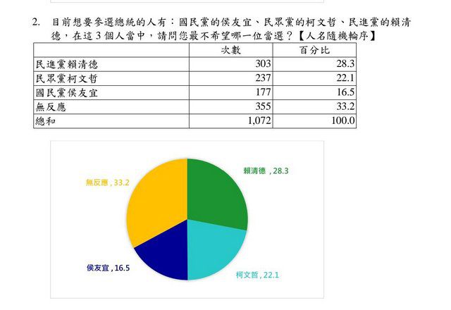 該民調顯示,民眾最不希望賴清德當選(28.3%),其次是柯文哲(22.1%),再其次是侯友宜(16.5%)。另有近半數民眾不支持鴻海創辦人郭台銘參選2024,且超過半數認為郭的參選最有利於賴清德。“最不希望誰當選”一般被解讀為仇恨值,由此數字顯示國民黨侯友宜最低。