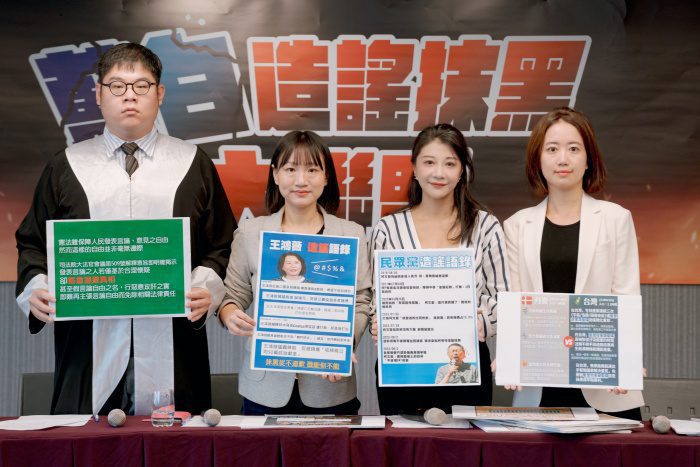 民進黨發言人林楚茵、競辦發言人、新北市議員戴瑋姍及台北市立委參選人謝佩芬、律師團許渝澤律師上午召開記者會,揭露藍白造謠抹黑語錄,從去年疫苗抹黑到今年綠能、前瞻、再到進口蛋等議題,為攻擊民進黨,摧毀政府信任,一再造謠,相關言論恐已涉法。