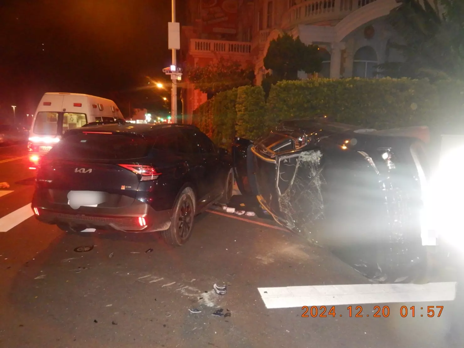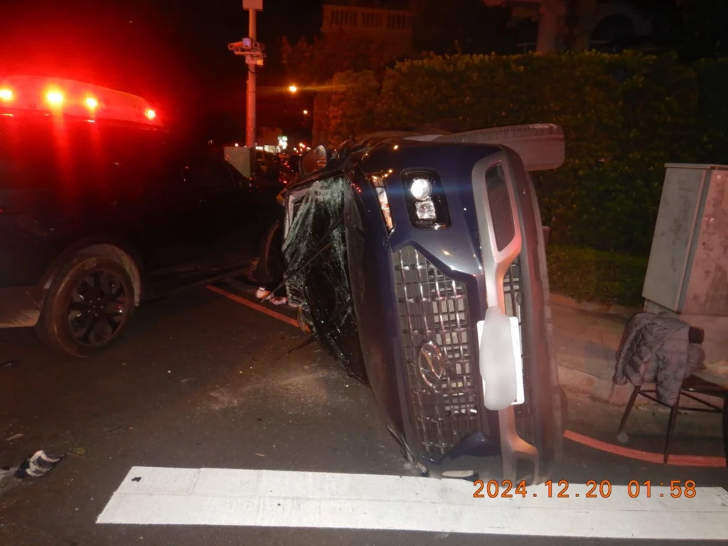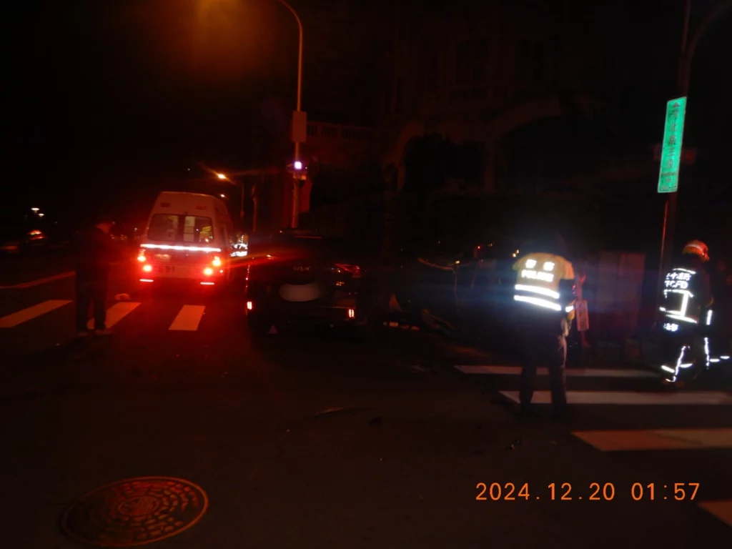 警方表示,這起事故發生在12月20日0時34分,王姓男子(62歲次)駕自小客車沿河北路往南直行(閃光紅燈),陳姓男子(39歲)駕駛自小客車沿崇德五路往東直行(閃光黃燈),雙方在河北路與崇德五路口碰撞後,王男自小客車側翻,