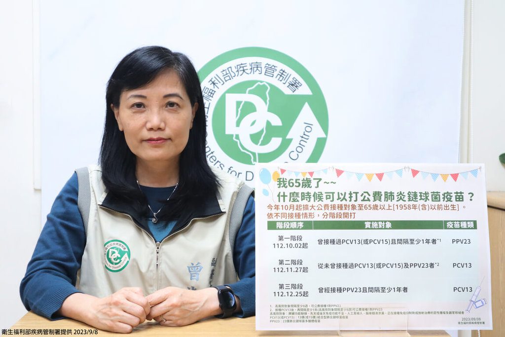 疾管署今(8)日表示,為提供65歲以上民眾更完整的免疫保護力,有效減少侵襲性肺炎鏈球菌感染症(IPD)發生風險,降低長者因感染肺炎鏈球菌導致嚴重併發症或死亡風險及衍生醫療負擔,宣布於今(2023)年10月2日起分三階段擴大65歲以上民眾[1958年(含)以前出生]公費接種1劑13價結合型肺炎鏈球菌疫苗(PCV13)及1劑23價肺炎鏈球菌多醣體疫苗(PPV23)疫苗。