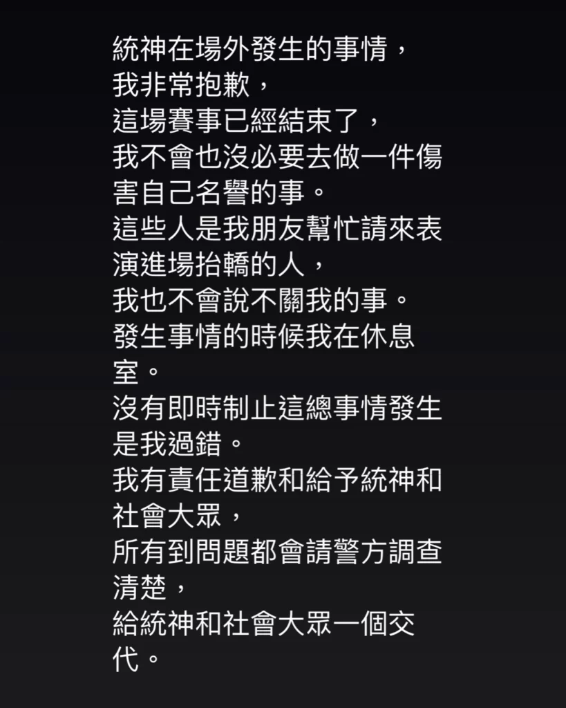 蹦闆也發文說,統神在場外發生的事情,我非常抱歉,這場賽事已經結束了,我不會也沒必要去做一件傷害自己名譽的事。這些人是我朋友幫忙請來表演進場抬轎的人,我也不會說不關我的事。發生事情的時候我在休息室。沒有即時制止這總事情發生是我過錯。我有責任道歉和給予統神和社會大眾,所有到問題都會請警方調查清楚,給統神和社會大眾一個交代。