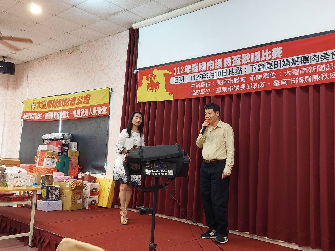 台南市112年度「議長盃」歌唱比賽10日在下營區田媽媽鵝肉餐廳隆重登場,比賽過程精采激烈,選手們出色的歌唱技巧,讓台下觀眾讚嘆,掌聲不斷。最終由郭麵麵及黃琨聰夫婦拿下冠軍及殿軍,由市議員陳秋宏頒發獎牌及獎品鼓勵。
